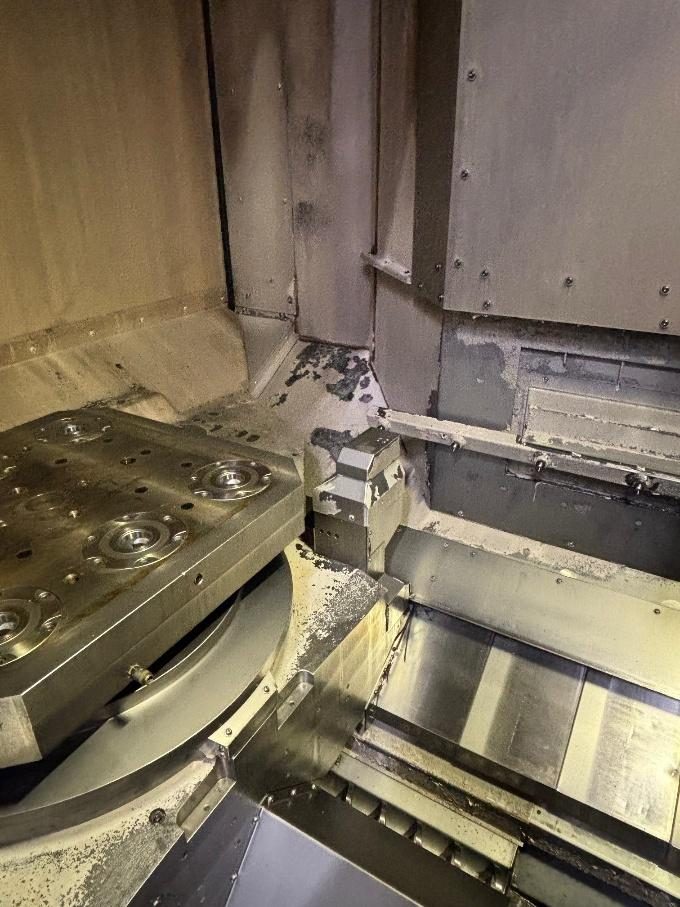 Table/Pallet: 630×630 mm; max load 1,200 kg; max workpiece Ø1000×1000 mm; indexing 0.001°; table drive 3.8 kW; index 90°/180° 2.0/3.0 s; pallet change 7 s